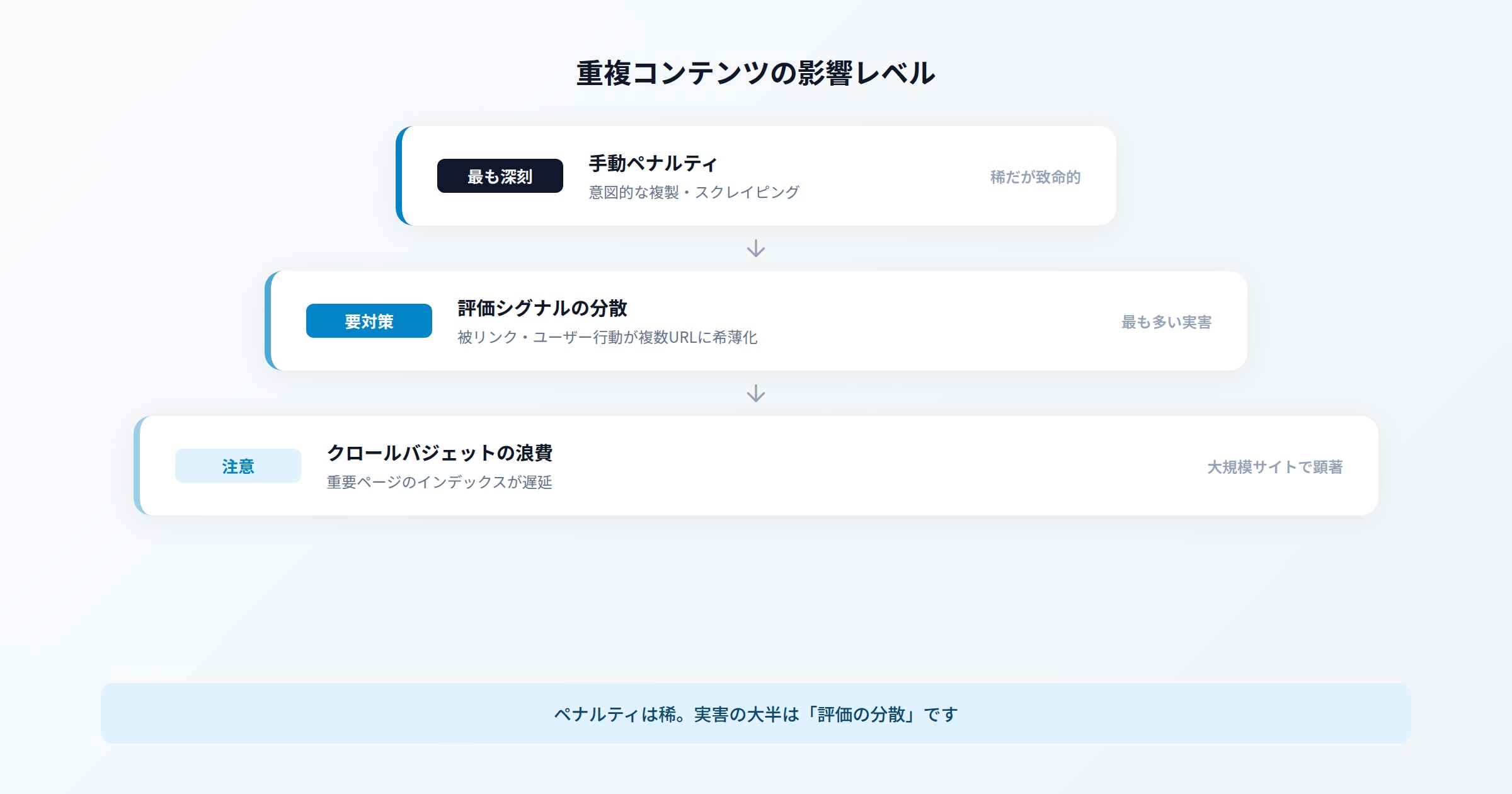 - 重複コンテンツ自体はペナルティではないが、評価の分散による順位低下は深刻なビジネスインパクトをもたらします
