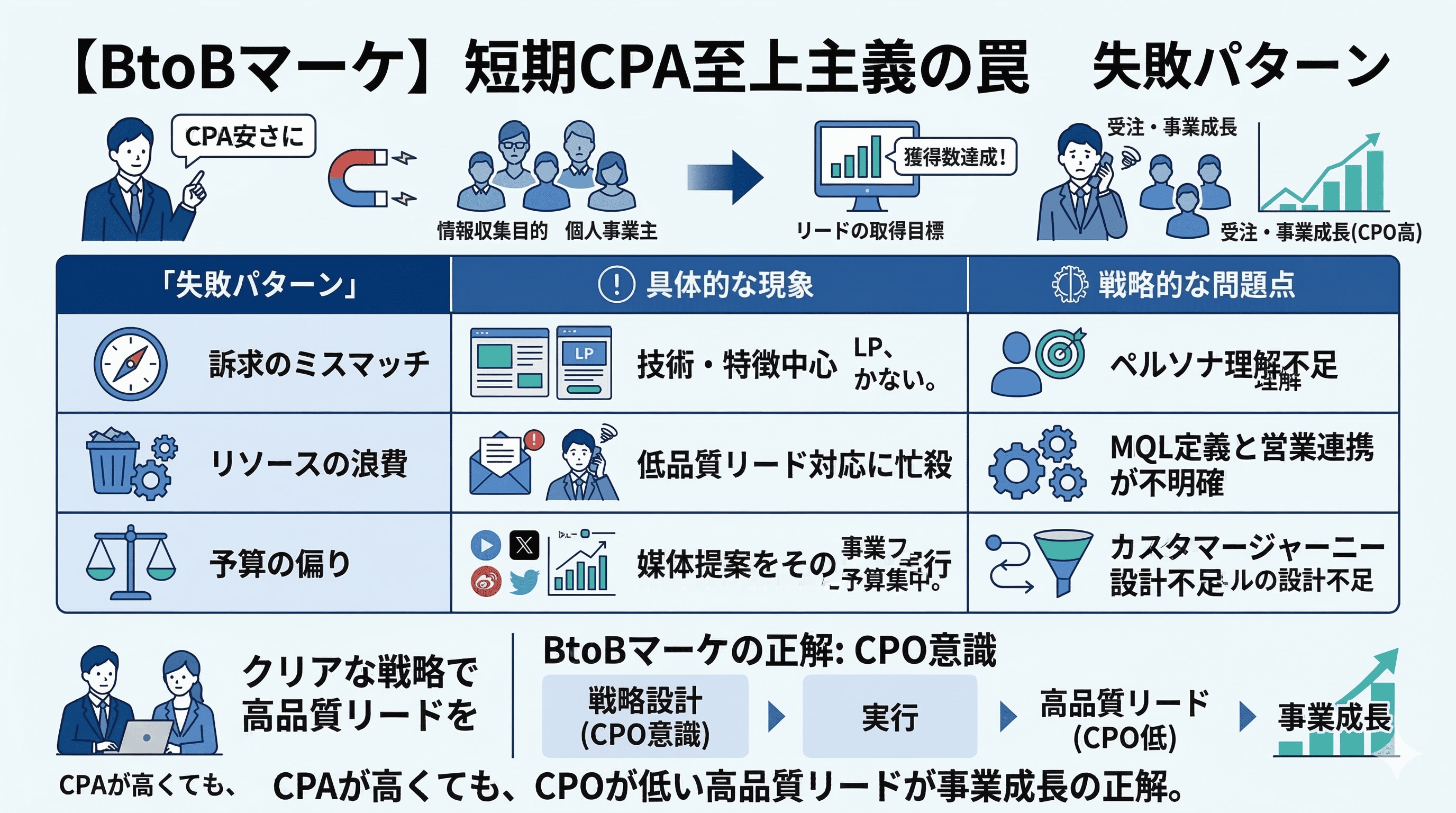 BtoBマーケティングにおいては、CPAが高くても、受注単価(CPO)が低いリードを獲得することが、事業成長における正解です。そのためには、初期段階でCPOを意識した戦略設計が必須となります。