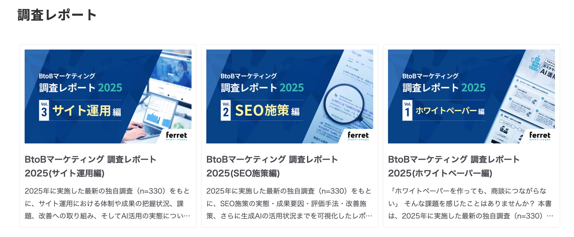 ferretでは、BtoBマーケティングに携わる方々からの認知向上を目指し、一次情報の発信を強化しています。その取り組みとして、約330社のBtoB企業のマーケティング担当者を対象にアンケート調査を実施し、全9本の「BtoBマーケティング調査レポート」を作成しました。