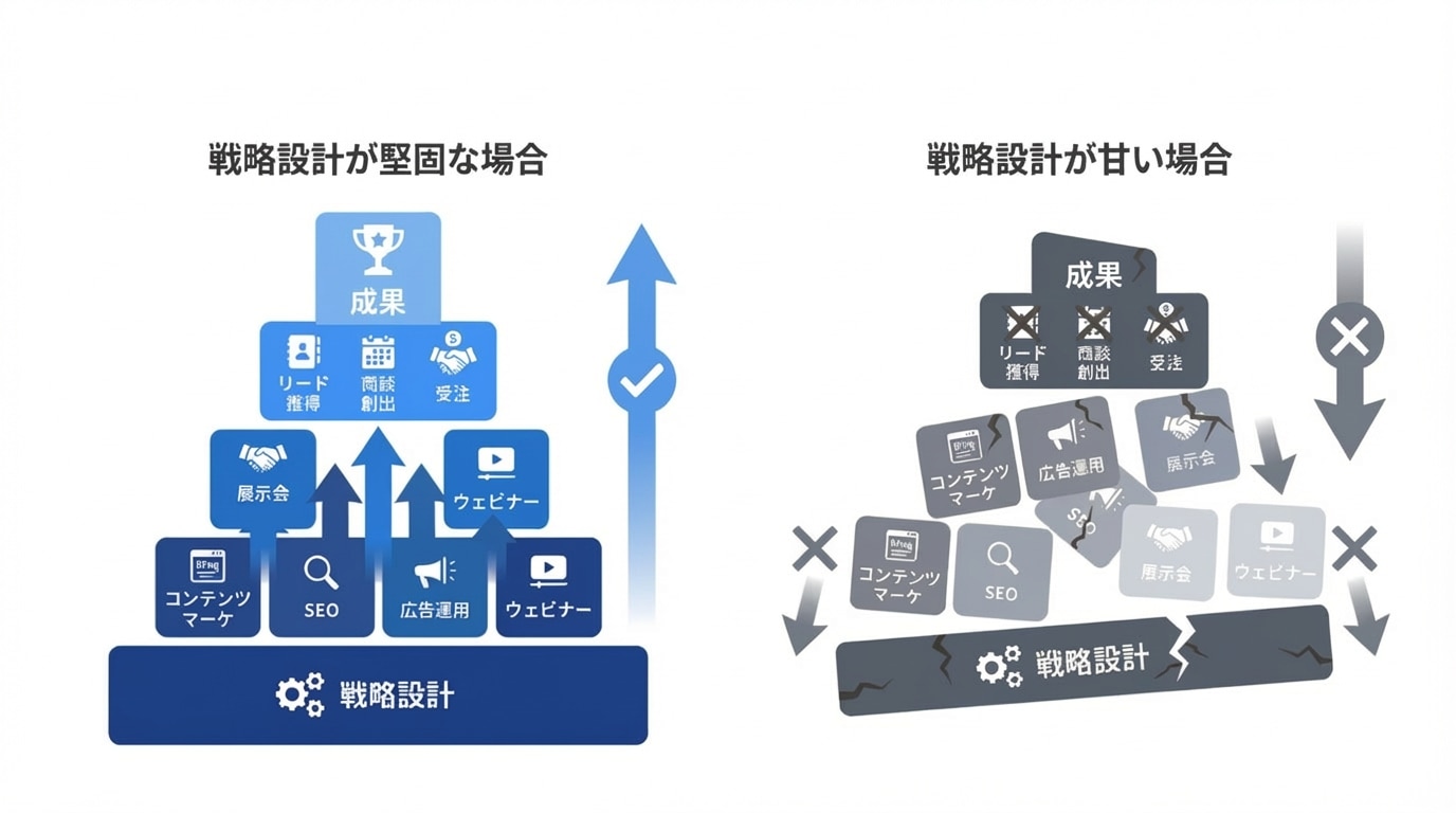 前述した「施策の目的化」「PDCAの停滞」「営業連携の情報の断絶」といった課題は、すべて「施策を実行する前」の段階、すなわち「戦略設計」の甘さに起因しています。土台が堅牢でなければ、それを前提とした各施策もいずれ崩れるということです。