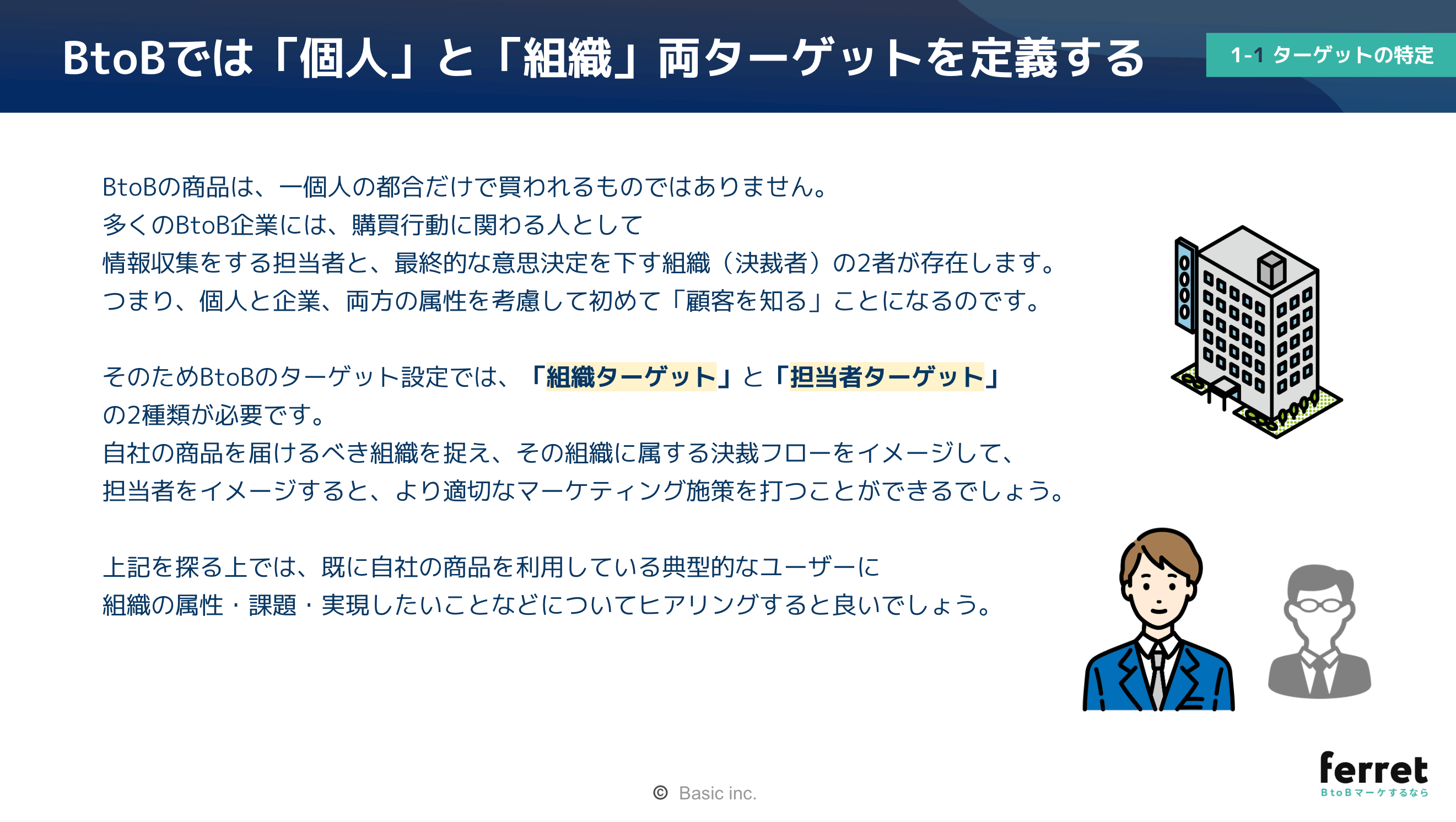 BtoBマーケティングのすべての施策は、この「土台作り」の上に成り立ちます。ferretソリューションの体系化されたノウハウ(ferret BtoBグロースステップ)でも、まず「BtoBマーケの土台を作る」としてこのステップを最重要視しています。
