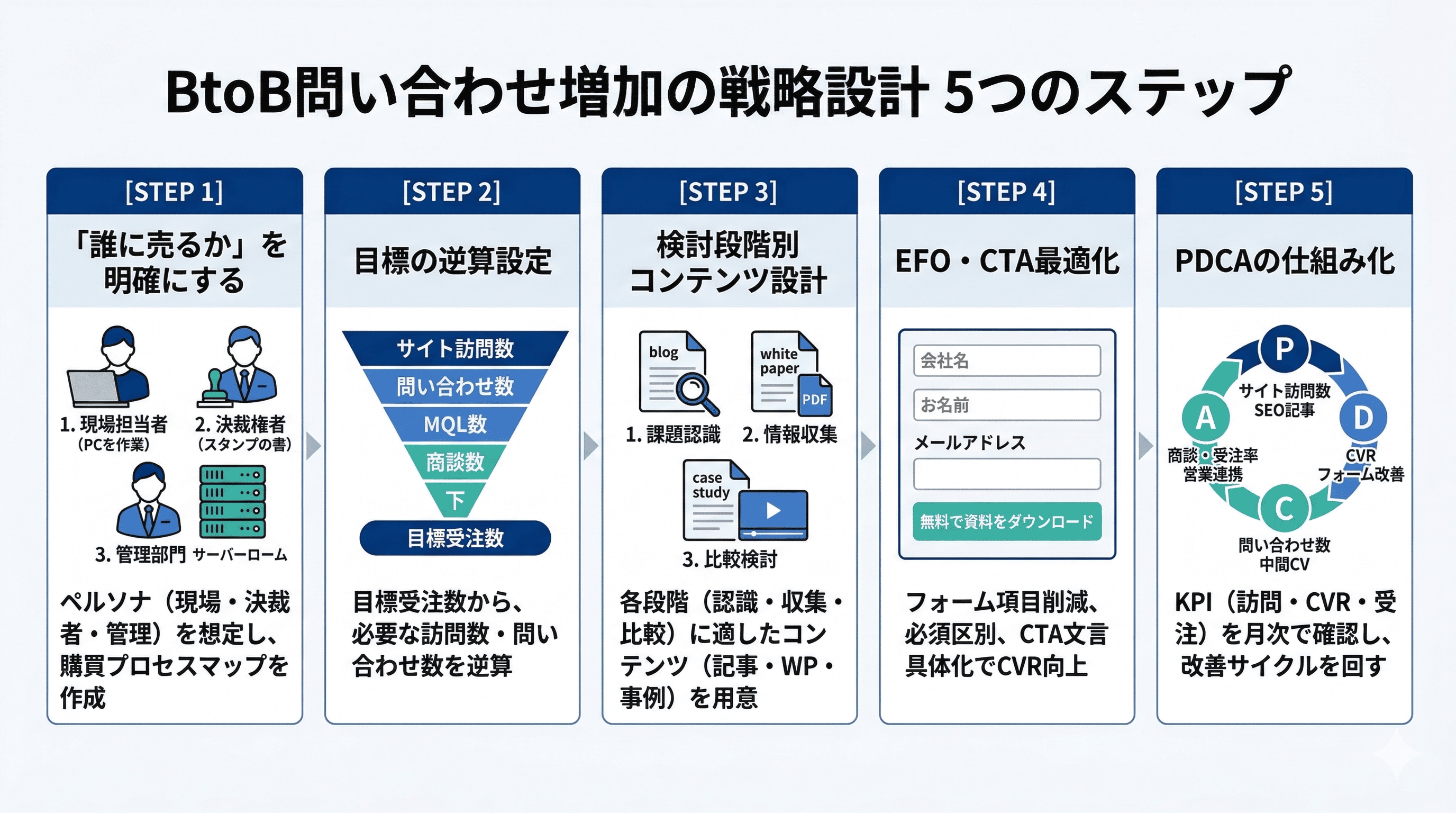 根本原因を踏まえた上で、問い合わせを増やすための具体的な戦略設計を5つのステップで解説します。