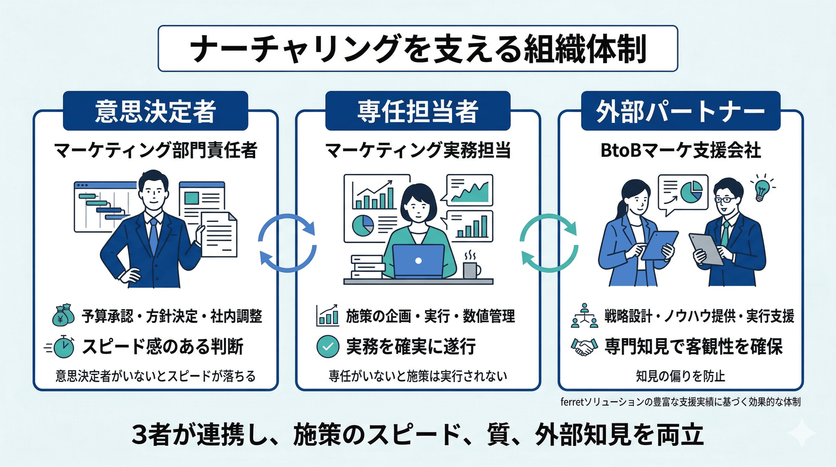 ferretソリューションの6,650社以上の支援実績に基づくと、マーケティング施策を成功に導くには「三位一体」のチームが効果的です。
