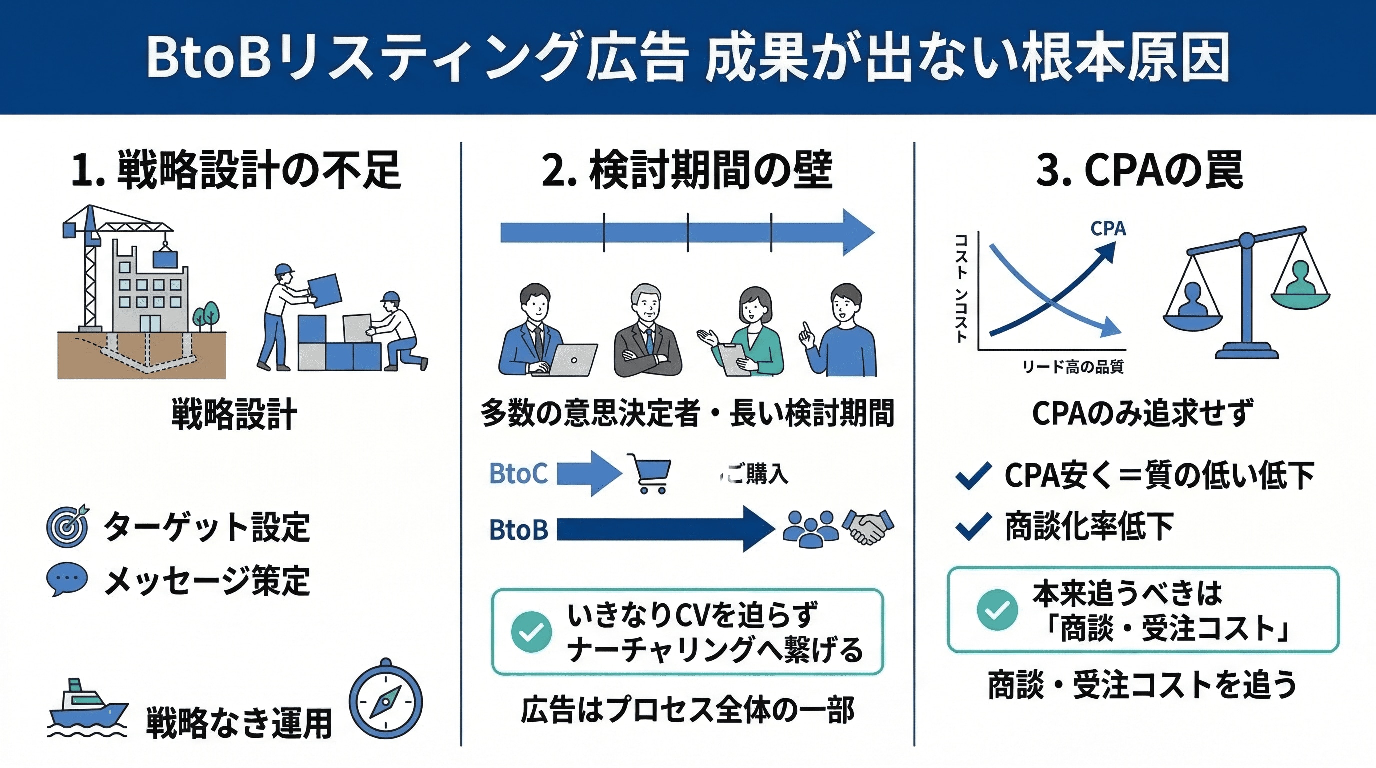 - BtoBリスティング広告の失敗原因は「運用テクニック」以前の「戦略設計」の欠如にある