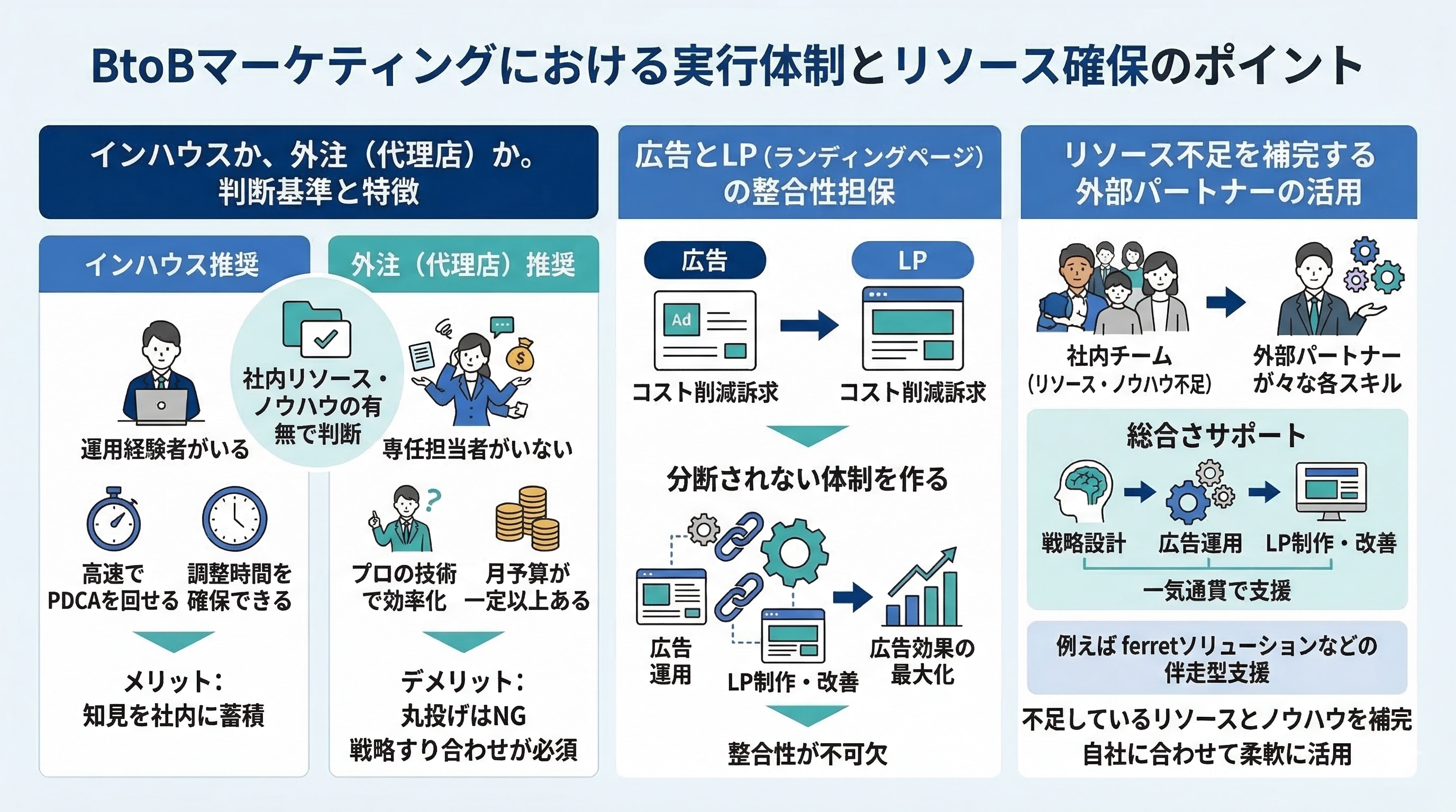 そのような場合は、単なる作業代行ではなく、上流の戦略設計から実務の代行、サイト改善までを一気通貫で支援できるパートナーを選ぶことが一つの解です。例えば、「ferretソリューション」のような、BtoBマーケティングに特化した伴走型支援サービスであれば、戦略の策定からLP制作、日々の広告運用まで、不足しているリソースとノウハウを補完しながらプロジェクトを推進することが可能です。自社の状況に合わせて、柔軟に外部リソースを活用しましょう。