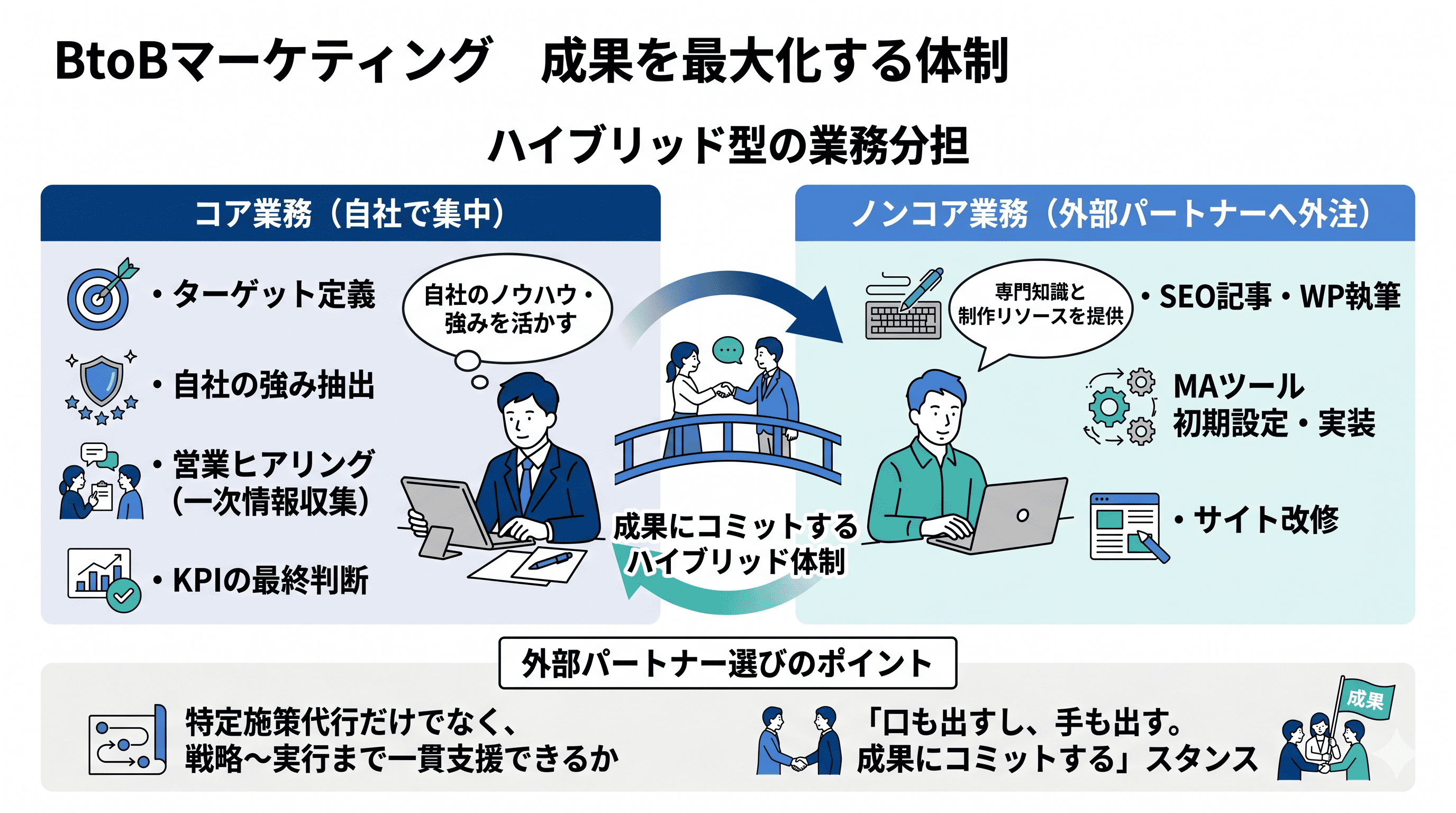- 内製と外注を戦略的に使い分ける——戦略設計は内製、コンテンツ制作やWebサイト改修は外注が効果的