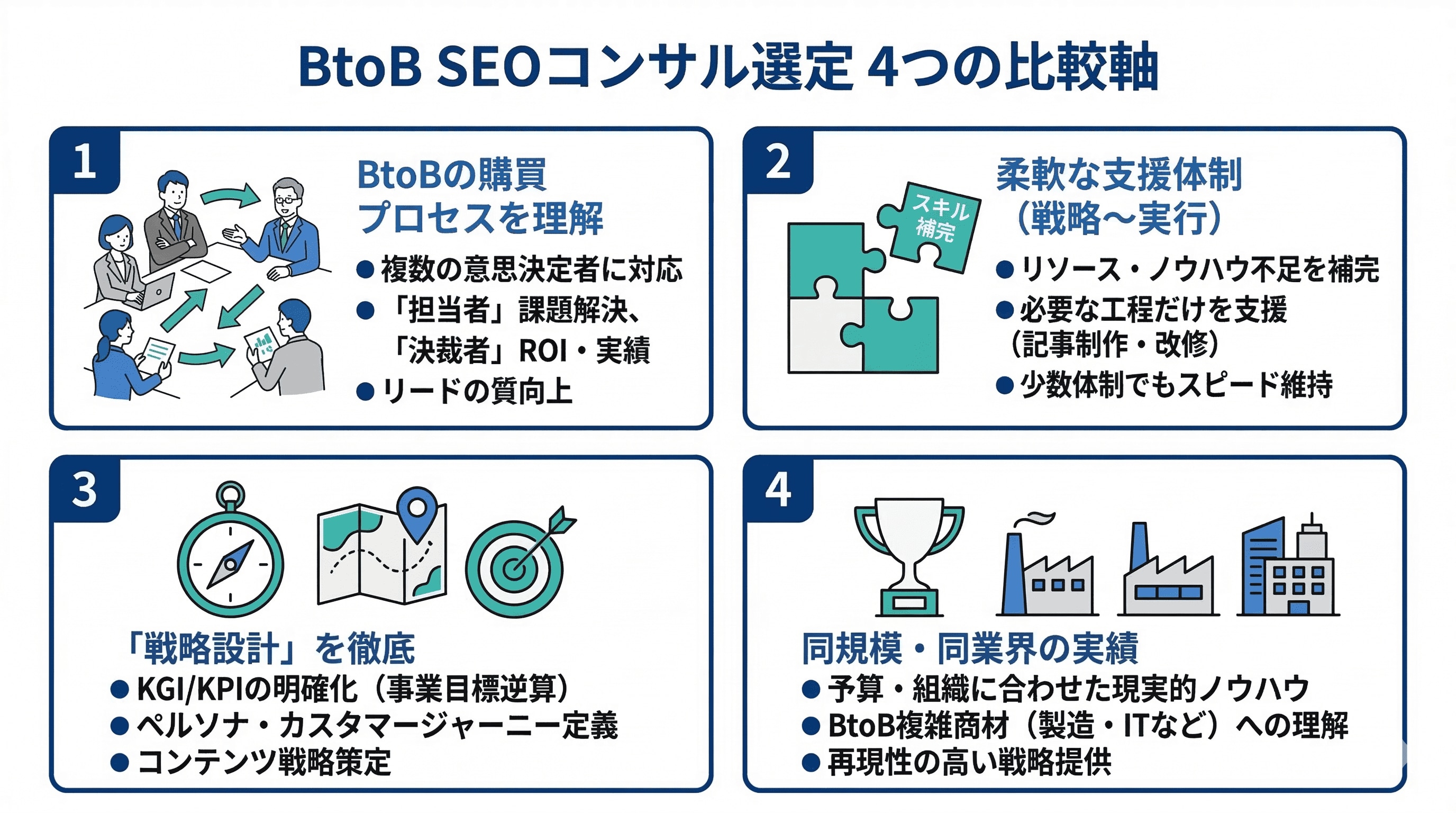 コンサル選定の4つの比較軸:「BtoBの意思決定構造の理解」「柔軟な支援体制」「戦略設計の重視」「同規模・同業界の実績」といったBtoB特有の観点で見極めましょう。