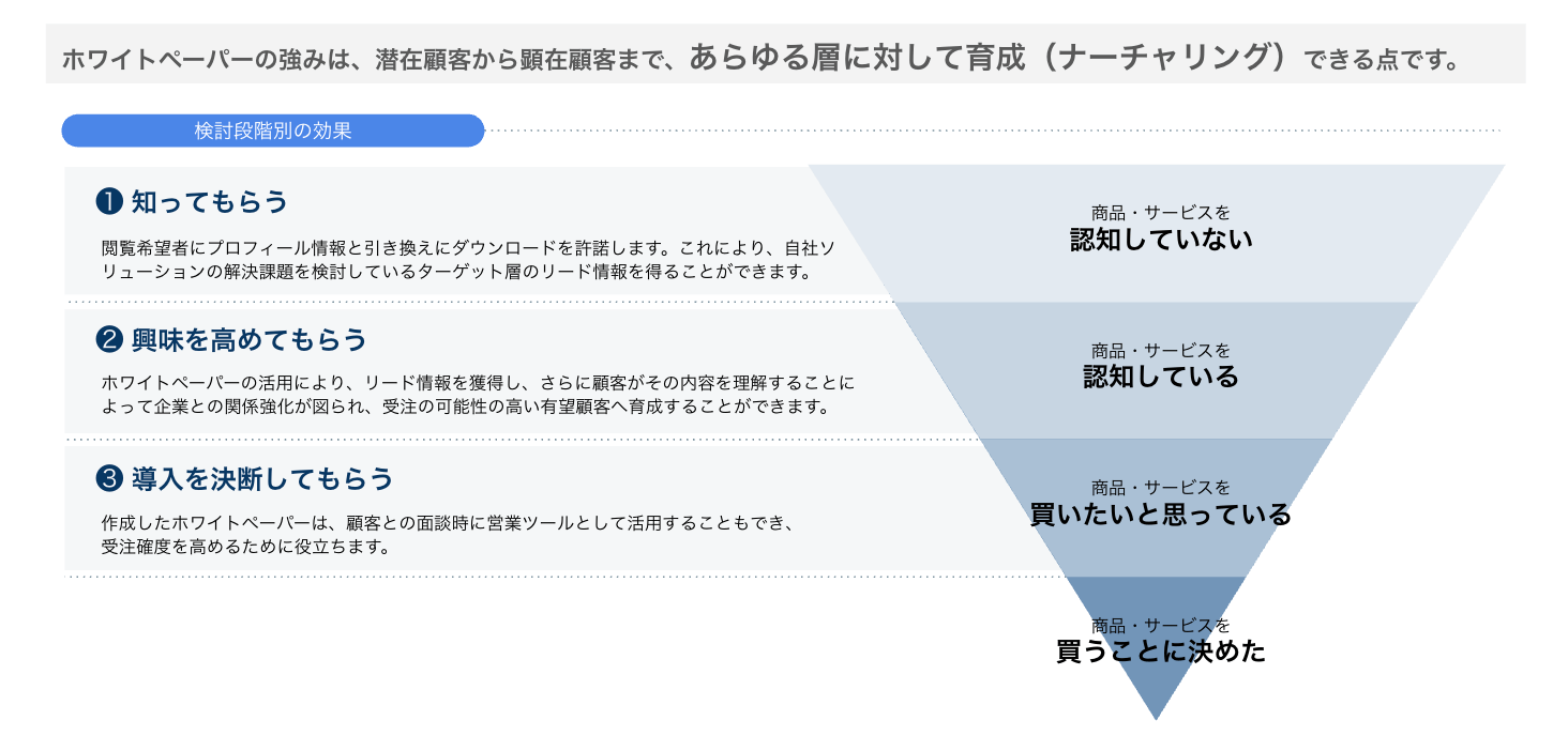 インサイドセールス(IS)やフィールドセールス(FS)にとって、ホワイトペーパーは単なるリード情報源ではなく、テーマの設計次第では潜在顧客から顕在顧客まで、あらゆる検討の温度感の顧客を育成(ナーチャリング)できることが活用メリットとなります。