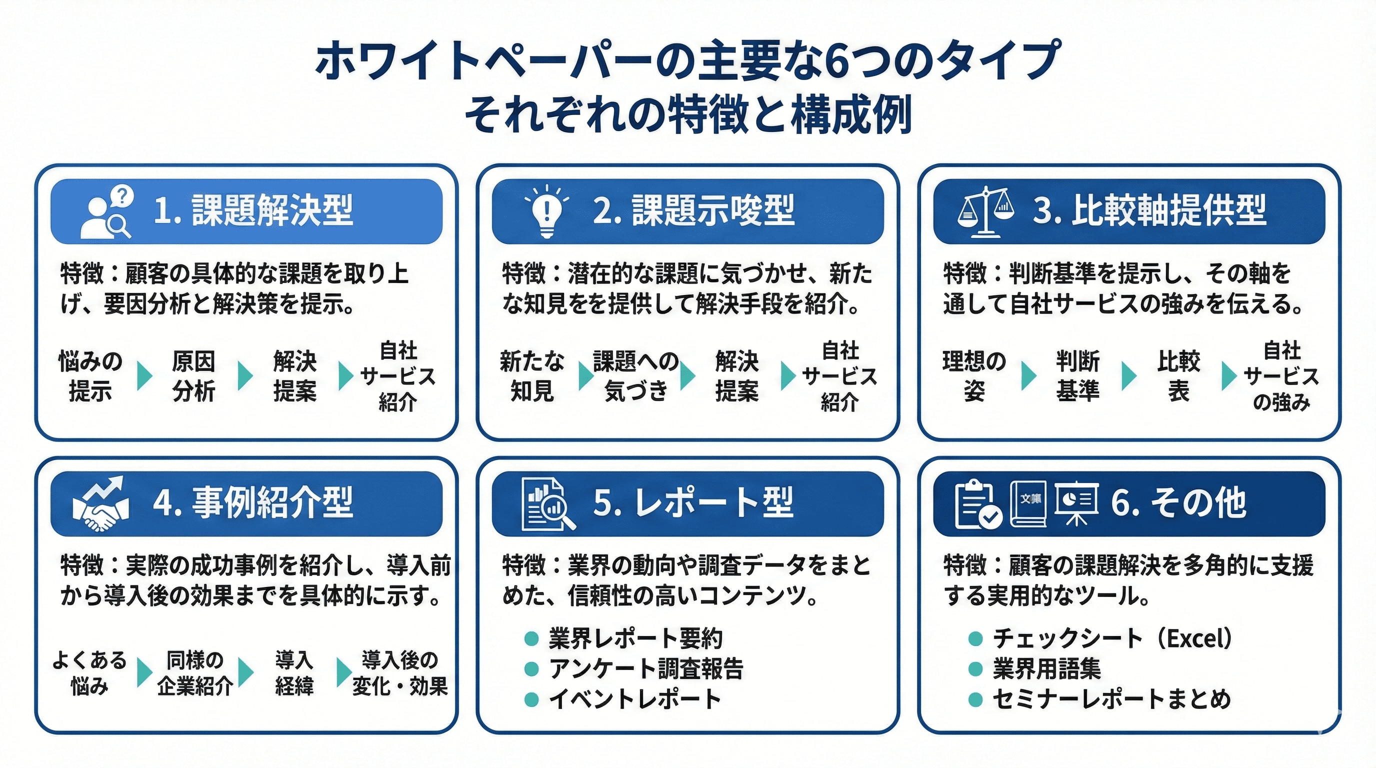 ホワイトペーパーの主要な6つのタイプについて、それぞれの特徴と構成例を紹介します。