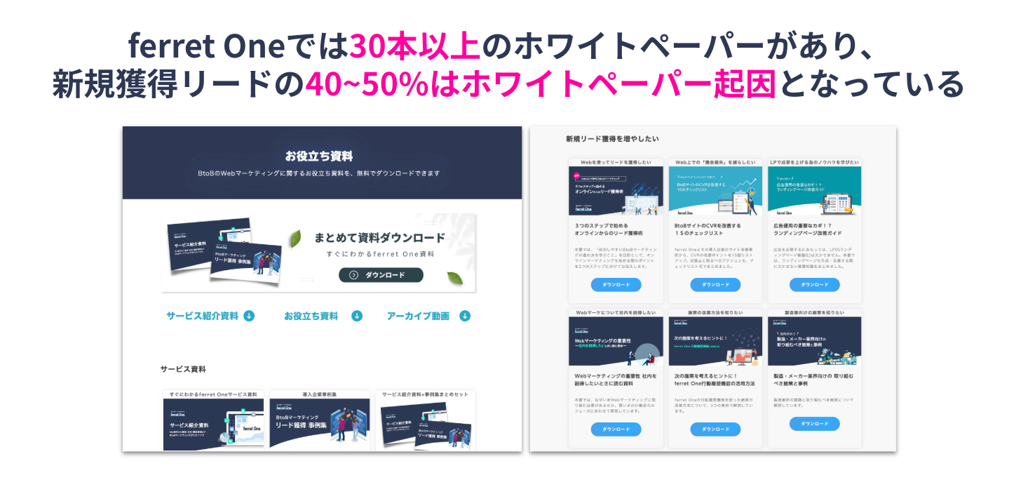 BtoBマーケティングにおいて、ホワイトペーパー(WP)は非常に重要な役割を担います。実際にferret Oneでは、30本以上のWPを運用することで、新規リードの40〜50%をWP経由で獲得しています。