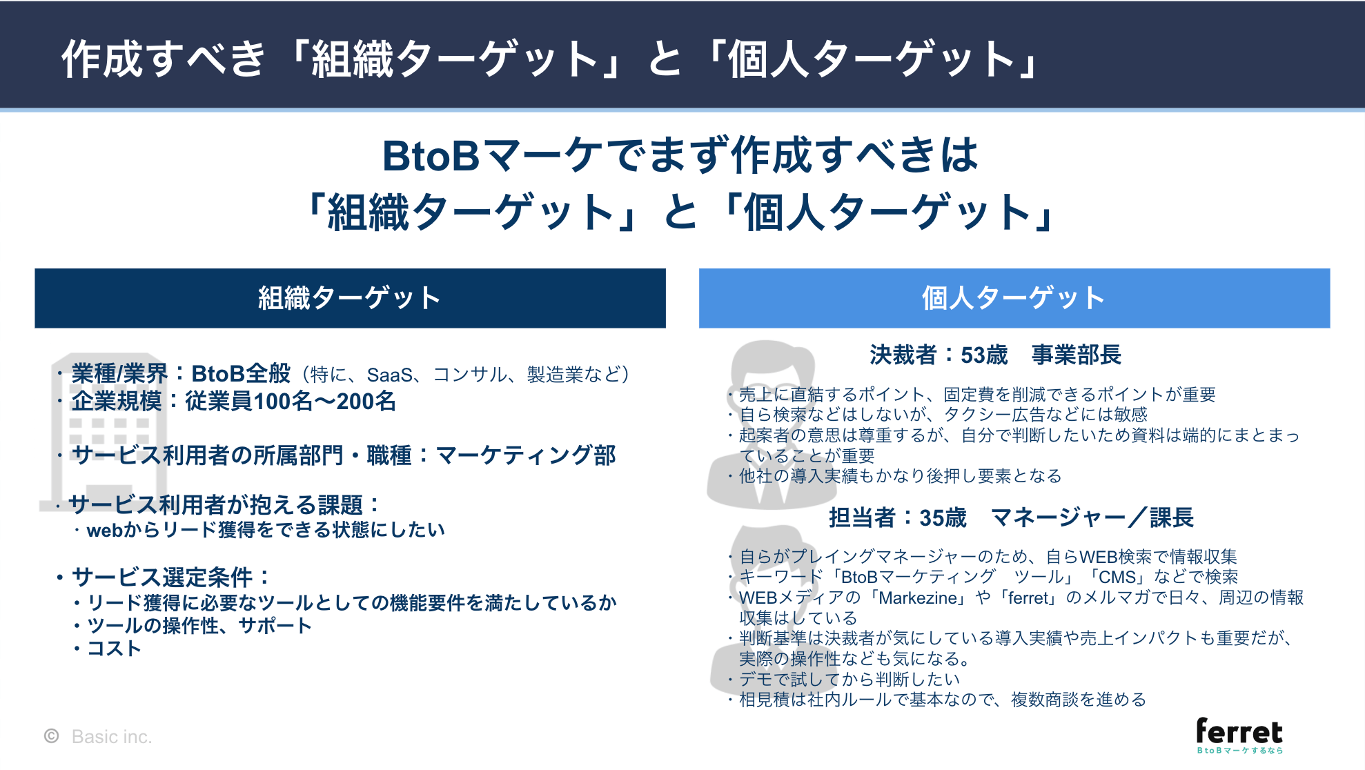 単なる部署名・役職名ではなく、具体的な一人の人物像として定義します。BtoBでは「組織ターゲット」と「個人ターゲット(担当者・決裁者)」の両面から課題を分析することが重要です。