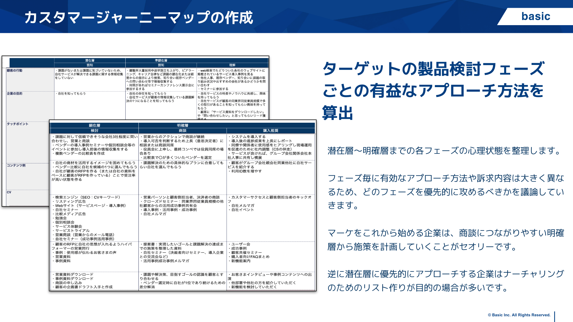 このマップを作成することで、「潜在層には課題示唆型の記事」「顕在層には比較検討型のコンテンツ(ホワイトペーパーや導入事例)」「商談客にはセールスコンテンツ」といった、フェーズごとに必要なコンテンツとアプローチ方法が明確になります。これにより、適切なコンテンツの優先順位付けが可能になり、場当たり的なコンテンツ制作を回避できます。