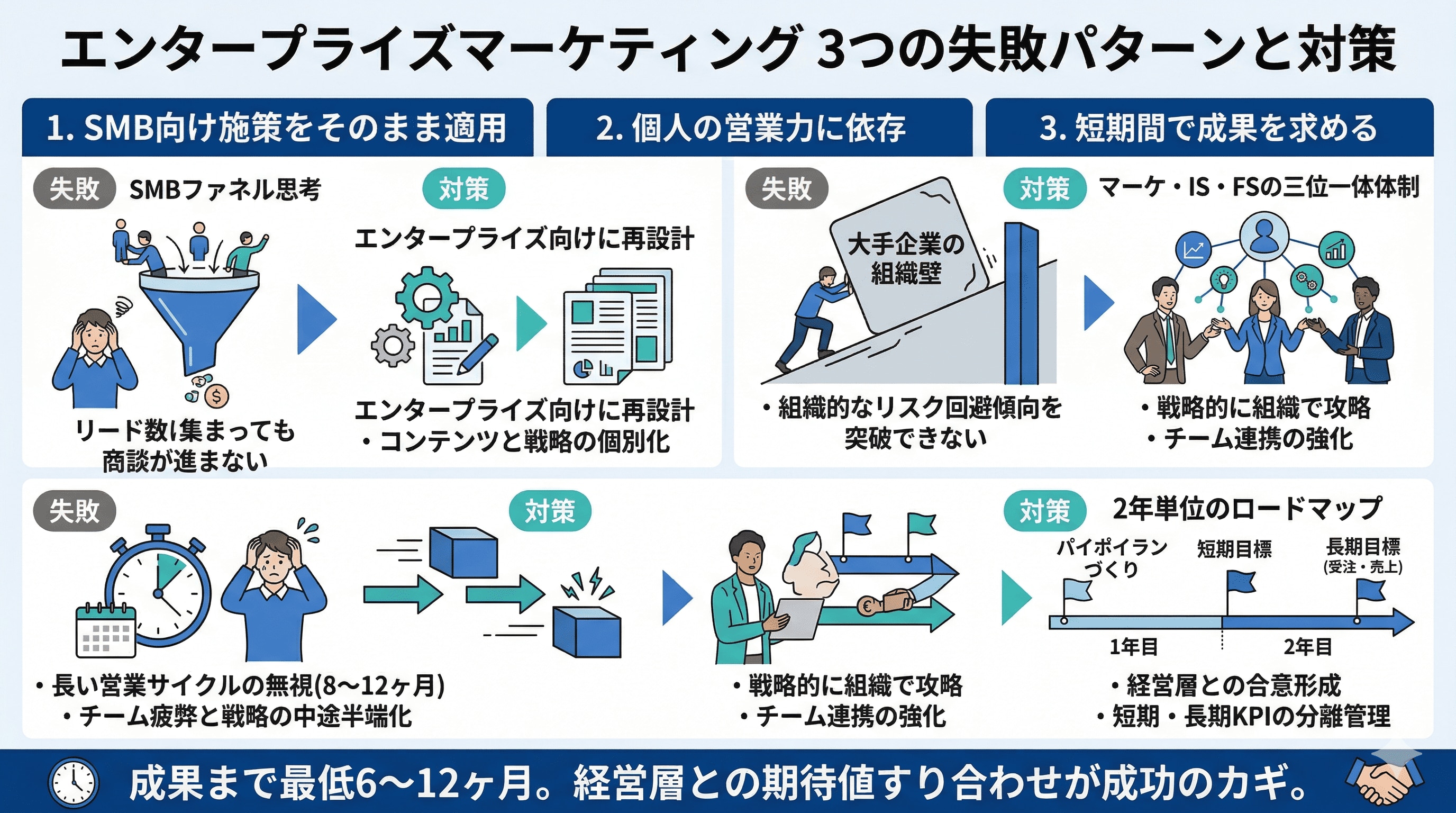 エンタープライズマーケティングに取り組む際、多くの企業が陥りやすい3つの失敗パターンがあります。